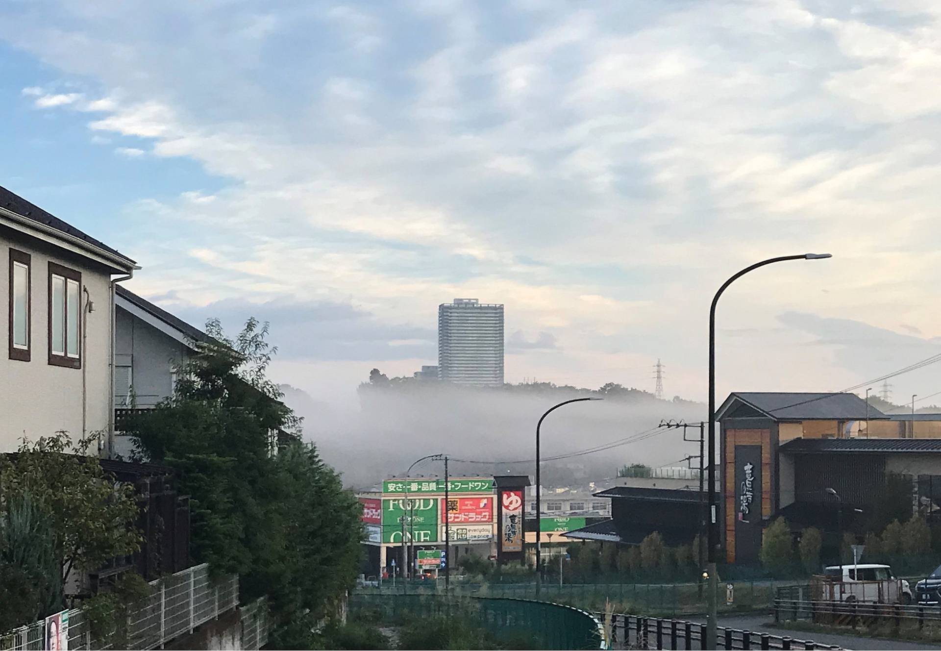 片倉つどいの森公園から湯殿川に向かって降りる八王子南バイパスからは、サザンスカイタワーが真正面に見えます。この日は川の上空に濃い朝霧が掛かり、それが雲海となって手前の河岸段丘を覆い隠し、まるで奥手のタワーが雲の上に浮いているかのような光景を呈していました。