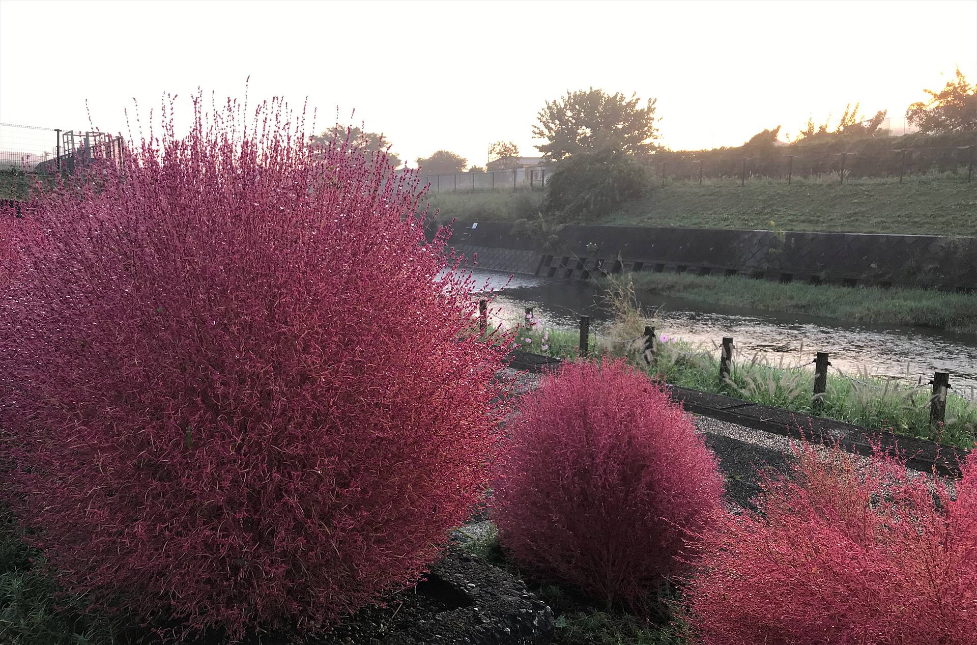 このような霧が出る条件は、川の水温が気温より高い時です。霧の中に飛び込むと、湿度が高く、箒草はしっかりと水分を溜めていました。背後はモヤが掛かった空に日が昇り始めたところです。