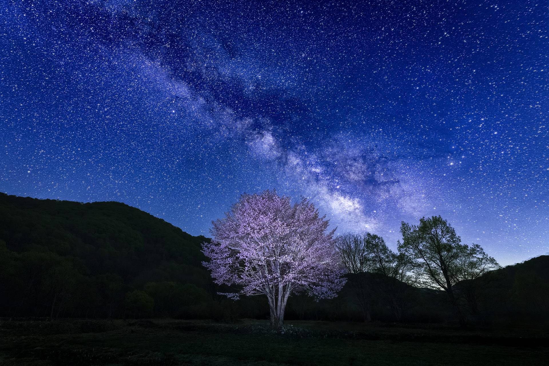 北塩原村の桧原の一本桜は福島県で最後に咲く桜です。ここは6年前から天の川とのコラボを企画していたのですが、桜の開花時期、星暦、天気が揃わず撮影が叶わなかったところで、今年やっと思い描いた写真が撮れました。深夜、熊にビビりながらの撮影を覚悟していましたが、変態さんが他に2名いたので安心して撮影することが出来ました。